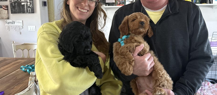 Henrietta and Hazel are two of Honey’s 8 puppies who have found their forever home together with Kasey and her husband. They are empty nesters who were excited to welcome not one, but two fluffy sisters into their lives to bring renewed energy, joy, and companionship. With years of experience loving and caring for large dogs, they were well prepared to give these girls everything they need to thrive. Their home includes a fully fenced yard perfect for running, playing, and exploring, along with a dog-friendly neighborhood filled with walking paths. The couple is home most of the time, and when they’re away, a trusted neighbor is always available to help. Henrietta’s feisty spirit pairs perfectly with Hazel’s calm, cuddly nature, allowing the sisters to grow up together as best friends. Welcome home, Henrietta and Hazel!